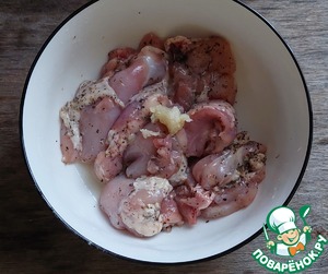 В половине специй обвалять куриное мясо. Добавить чеснок и имбирь, натертые на мелкой тёрке. Полить соком лимона (1/4 лимона). Хорошо перемешать, оставить мариноваться на 20-30 мин.