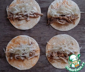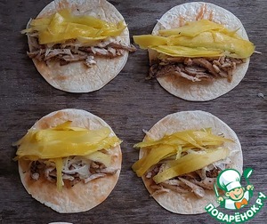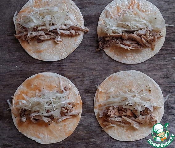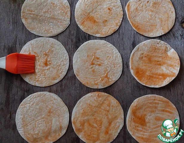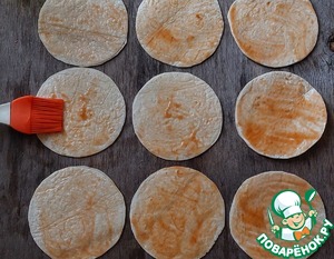 У меня были большие 4 лепешки из которых я вырезала лепешки диаметром 10-11 см., 12 штучек. Смазала каждую лепешку кисло-сладким соусом.