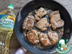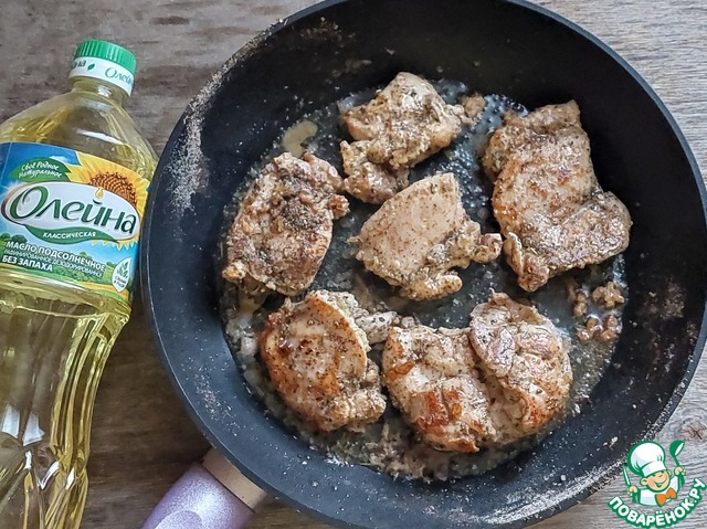 В сковороду, где обжаривались специи, налить 2 ст. л. растительного масла ТМ Олейна. Обжарить куриное мясо с двух сторон до золотистости, затем накрыть крышкой и на медленном огне 10-15 мин. потомить.