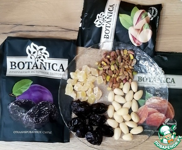 Чернослив и цукаты нарезать на несколько частей, фисташки раздавить плоской стороной ножа. Чернослив, миндаль и фисташки я взяла от ТМ BOTANICA, мне они нравятся по качеству и вкусу. А цукаты я выбрала из Смеси "Сладкой" этого же производителя.