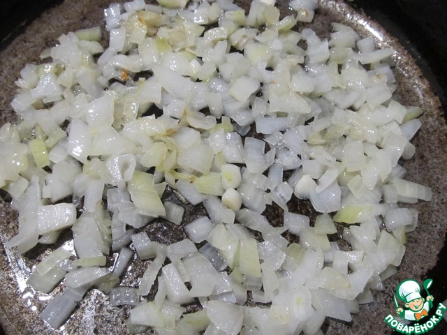 Лук порезать, пассеровать до мягкого состояния. Добавить измельченный зубчик чеснока и пасеровать еще пару минут.