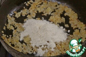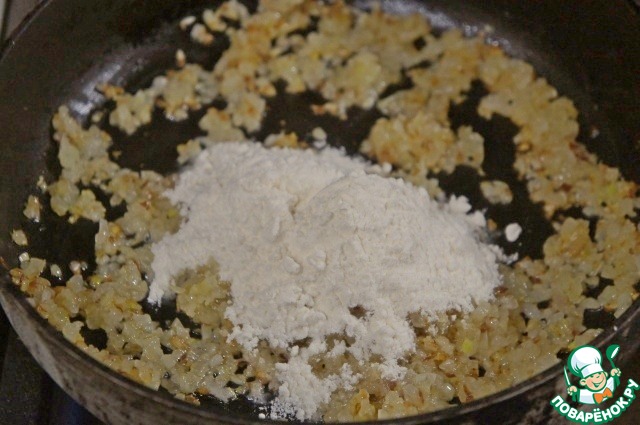Всыпать муку, перемешать и слегка обжарить, пару минут. Отставить.