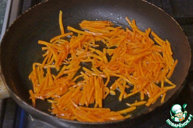 Морковь нашинковать соломкой и спассеровать до полуготовности.