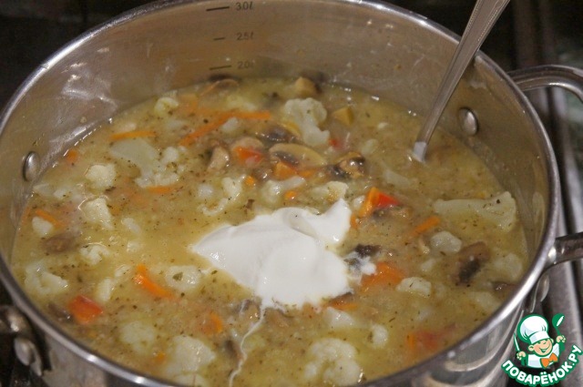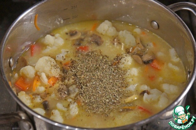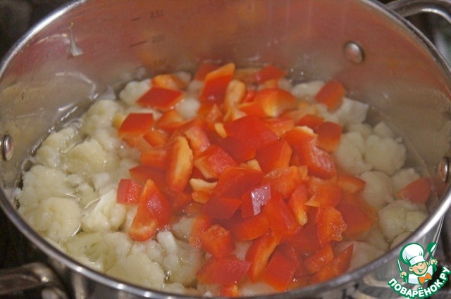 Цветную капусту разобрать на небольшие соцветия и припустить минуты 3 в подсоленной воде. Отвар слить, но не выливать.