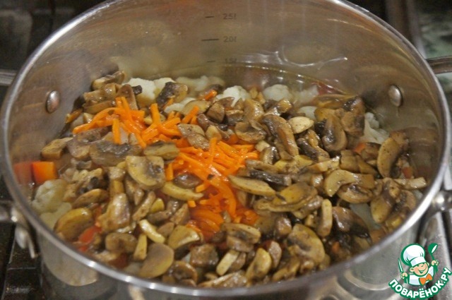 Затем всыпать грибы. Добавить морковь и лук. Все перемешать.