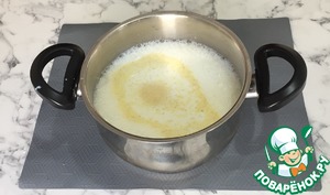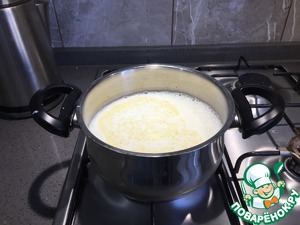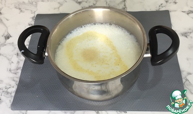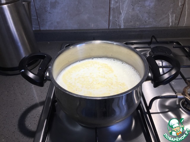 В кастрюлю выливаем молоко, всыпаем сахар и манку.