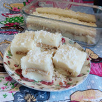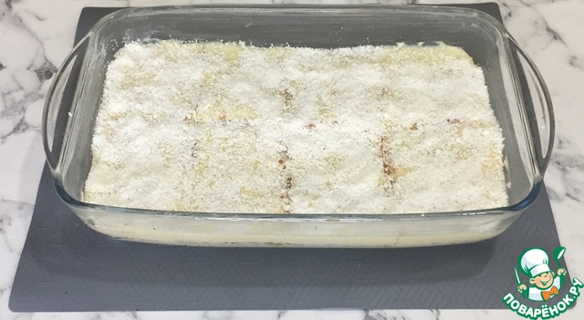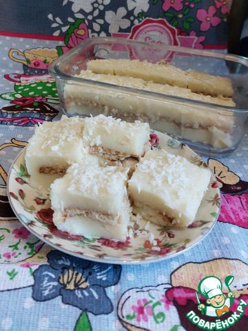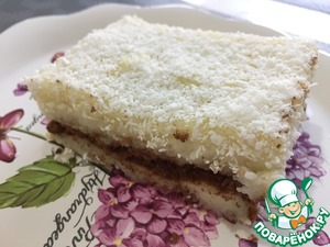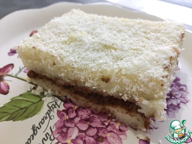 Разрезаем нашу сладость на порционные кусочки. Сверху посыпаем кокосовой стружкой.