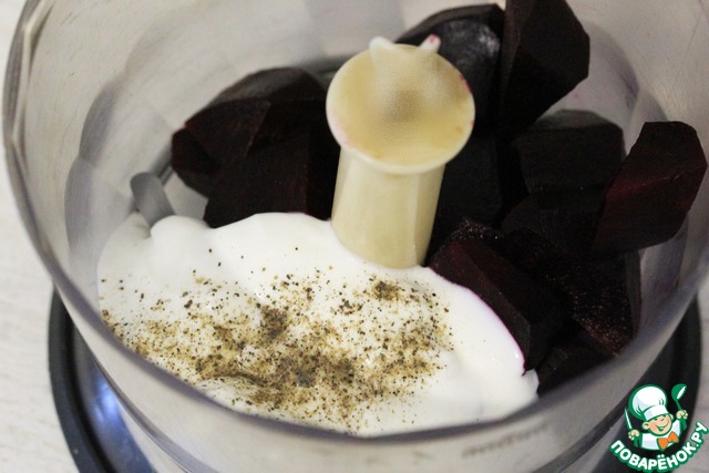 Отварную или запеченную свеклу очистить, нарезать на кусочки и выложить в чашу блендера.