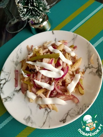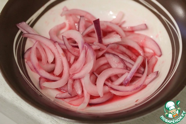 По мясу замена, использовала ранее приготовленную "Прессованную свинину одним куском в ветчиннице" и лук белый салатный