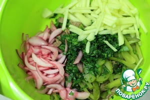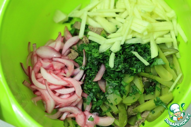 Сложить все в глубокую миску, добавить маринованный лук (маринад слить).