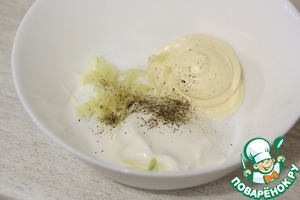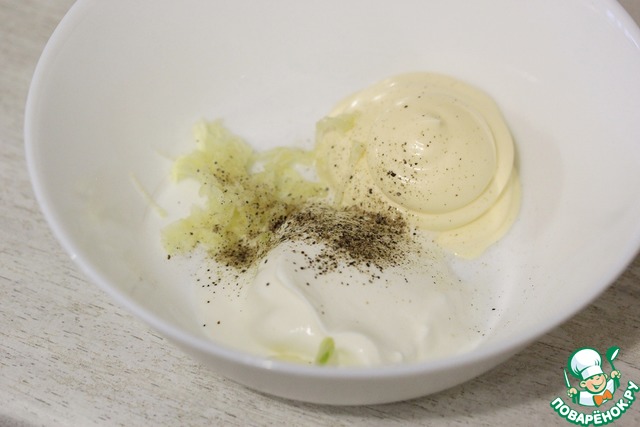 Для заправки смешать сметану, майонез, чеснок и черный молотый перец.