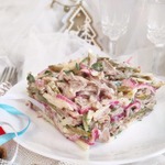 Очень вкусный салат! Делала с курицей, перестаралась с луком, очень много его было в салате но все равно гости смели его со стола очень даже быстренько Спасибо Вам!!