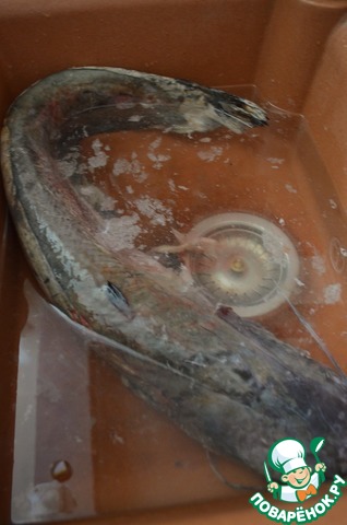 Главное, при приготовлении сома - тщательно его почистить, удалить жабры и счистить слизь. А с сомом это не так то просто, может это и пугает многих. Необходимо рыбу поместить полностью в воду и чистить ножом, соскабливая и удаляя слизь. Воду несколько раз поменять. В конце промыть и обсушить бумажным полотенцем. Обрезать плавники и хвост. В моём случае сом весом 2,3 кг..