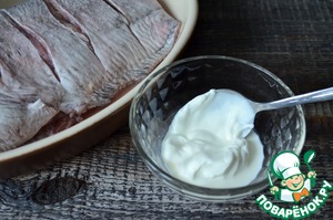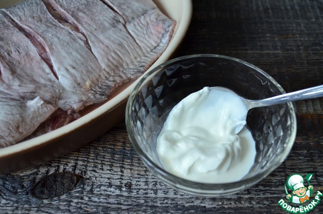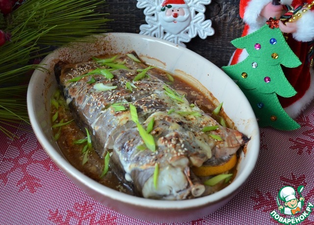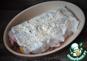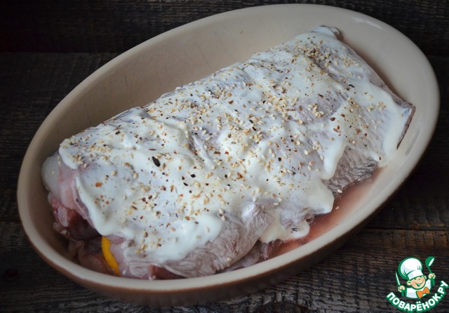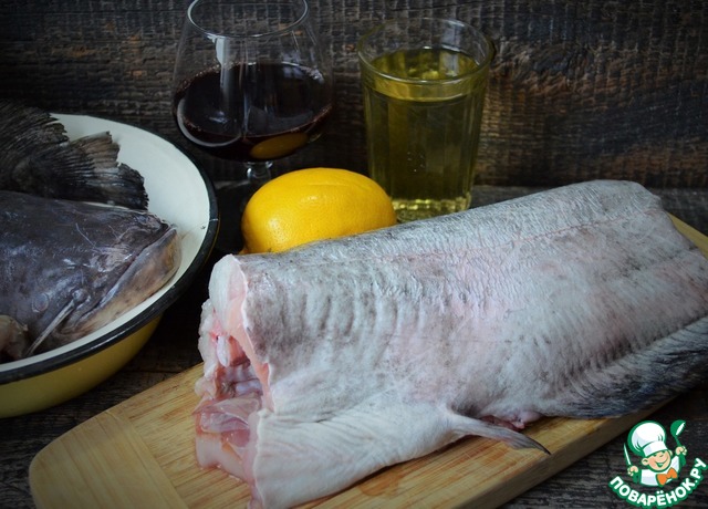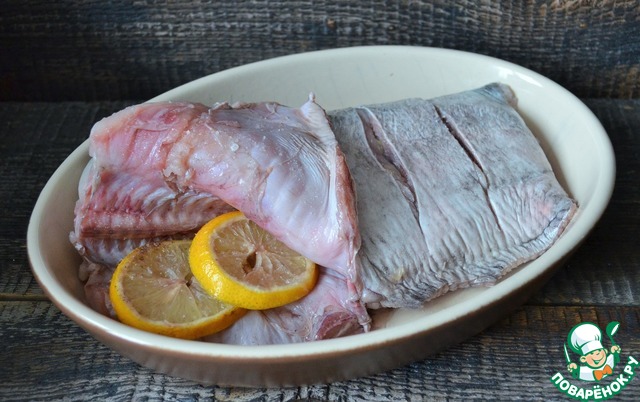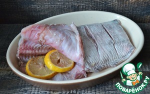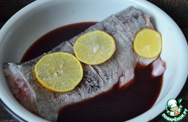 Рыбью тушку надрезать до хребта с обеих сторон, наметив порции. Смешать рассол и красное вино, тушку посолить, поместить в смесь, добавив ломтики лимона, оставить на 2-12 часов, несколько раз переворачивая. Замачивание в кислой среде убирает запах свойственный речной рыбе.