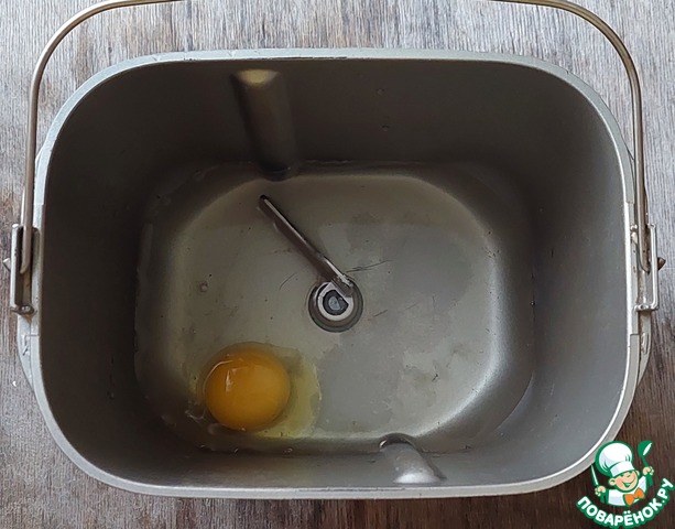 Тесто я буду замешивать в хлебопечке. В ведёрко хлебопечки вылить горячую воду (не больше 60-70 градусов), добавить яйцо и соль.