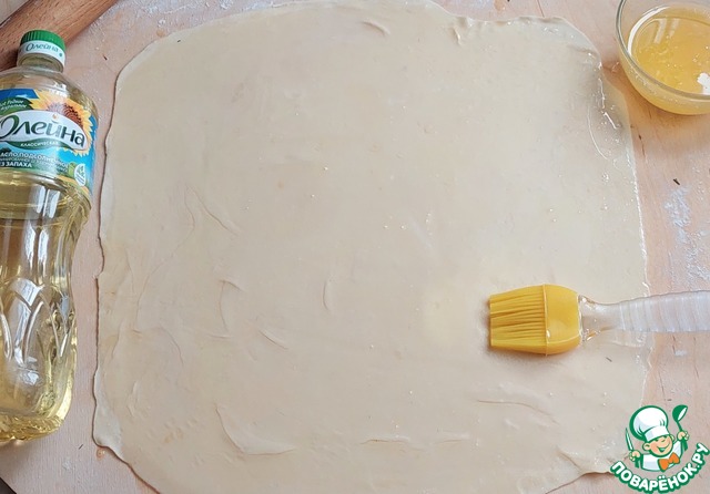 Тесто ещё раз вымесить и разделить на 4 части. Каждую часть как можно тоньше раскатать в прямоугольник. По необходимости под тесто подсыпаем муку, чтобы оно не прилипло к столу. Затем обильно смазать тесто смесью двух масел, с помощью силиконовой кисточки.
