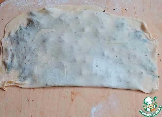 В тесто добавила около 30 мл. масла растительного, стало менее липкое и более пластичное, но начинкой всё-равно пачкается и скалка, и рабочая поверхность.