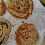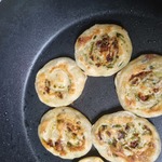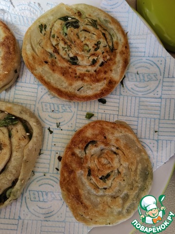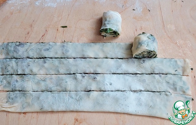 Размер рулетиков на ваше усмотрение. Можно свернуть первую полоску в рулет. Положить его на вторую полоску и завернуть, получится лепешка побольше. Я делала и большие и маленькие.