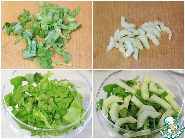 Листья салата вымыть, обсушить и нарезать на полоски.