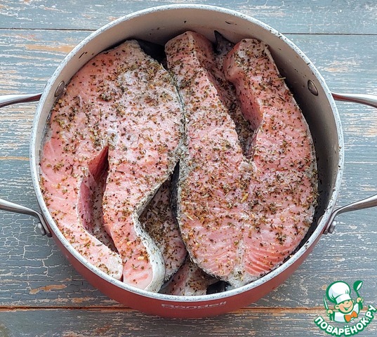 Каждый стейк лосося обтереть солью с двух сторон. Полить соком лимона, посыпать прованскими травами. Оставить мариноваться на 30 мин.