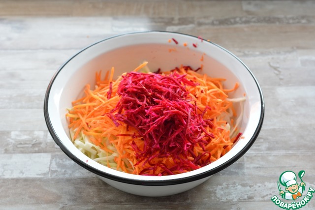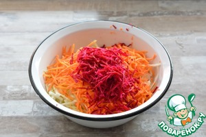 Капусту нашинкуйте тонкой соломкой. Лук репчатый полукольцами. Свеклу и морковь натрите на "корейской" тёрке или просто на крупной тёрке