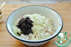 Влейте маринад, перемешайте и хорошенько руками помните лук.