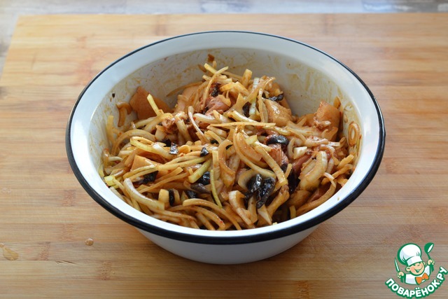 Насыщенное по вкусу и недорогое горячее блюдо. Жаркое из мяса свиной рульки с луком, черносливом, приготовленное в ароматнейшем маринаде.