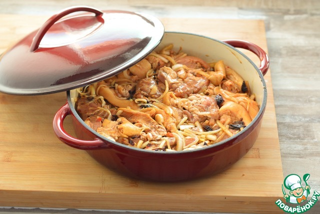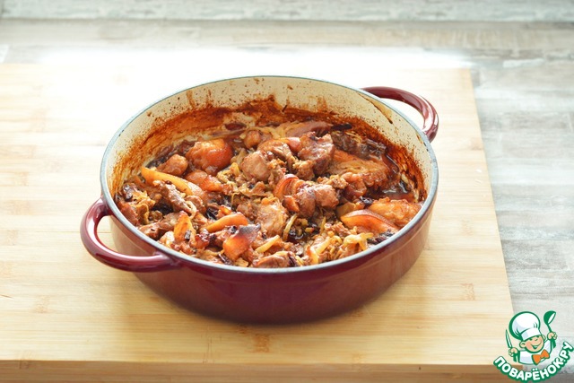Готовить жаркое лучше в толстостенной посуде с крышкой. Я готовила в чугунном сотейнике. Если нет такой посуды, то используйте форму для запекания, затянув её фольгой.