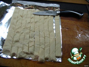 Пласты теста нарезаются ножом на 8 равных полос каждый