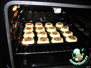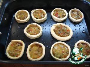 В остывшую начинку натираем сыр, добавляем сырое яйцо и перемешиваем всю массу. Столовой ложкой аккуратно заполняем внутренние пространства колец.