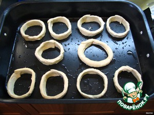 Кольца укладываем на противень, смазанный растительным маслом, соблюдая расстояние между ними в 15-20 мм. -
