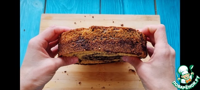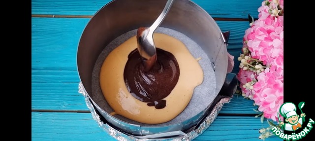 В кефир добавляем морковное пюре, растительное масло и хорошо перемешиваем, затем добавляем соду и снова хорошо перемешиваем. Далее в отдельной чаше в яйца добавляем соль, сахар и взбиваем миксером на большой скорости 5 - 7 минут. В отдельной чашке в муку добаляем разрыхлитель и хорошо перемешиваем. Теперь в взбитые яйца постепенно добаляем сухую смесь, чередуя с морковным кефиром и взбиваем на минимальный скорости, и так чередуем пока не закончиться мука и морковный кефир. Затем в отдельной чаше третью часть бисвитной смеси отделяем, просеиваем туда какао и хорошо перемешиваем лопаточкой. В форму 18 - 20 см стелим пергамент и выливаем смесь светлого теста чуть больше чередуя его с тёмным тестом. Далее отправляю в заранее разогретую духовку и выпекаю при 175 градусах 35 - 45 минут, ориентируйтесь по своей духовке. Бисквит получается очень высокий 8 см. Секрет в том, что кондитерское кольцо намного выше, чем обычная форма. -