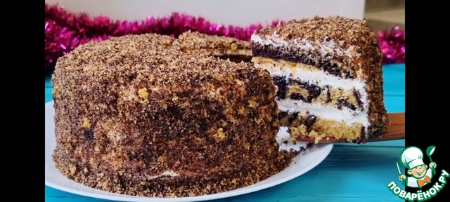 Торт отправляем в холодильник на 6 - 8 часов, а лучше на ночь. Затем посыпаем крошкой полностью торт. Торт готов!