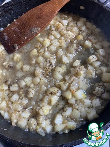 В сковороде, в которой жарилось мясо, обжарить лук и чеснок в течение 5 минут. Добавить яблоки и продолжать жарить еще около 2-4 минут.
