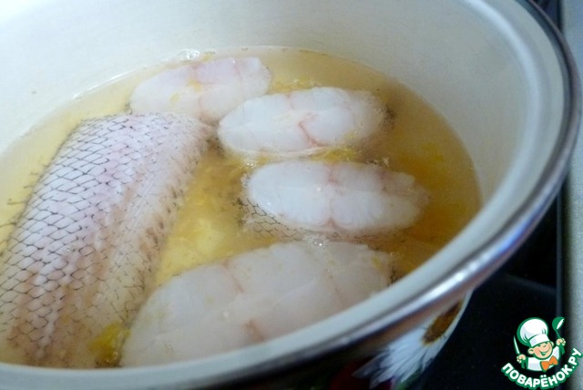Куски рыбы положить в овощной бульон, как только закипит, убавить огонь и варить минут 10. Огонь должен быть именно слабым, потому что от сильного кипения нежное мясо может развалиться.