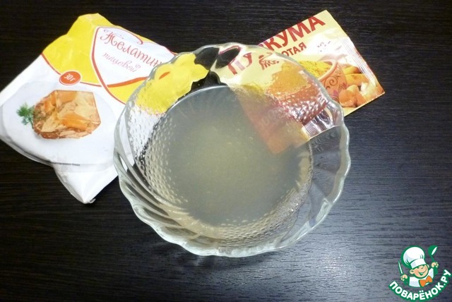 Отлить полстакана бульона и развести в нём желатин, ориентируясь на инструкцию на упаковке. Когда желатин разбухнет, долить ещё бульона до нужного объёма и слегка прогреть в микроволновке до полного растворения желатина.