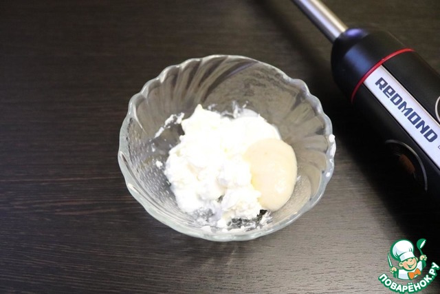 Для заливного из рыбы я готовлю приправу из сливочного сыра, сока лимона и хрена. Соль по вкусу. Можно положить зелень укропа или петрушки. Всё взбить блендером REDMOND.