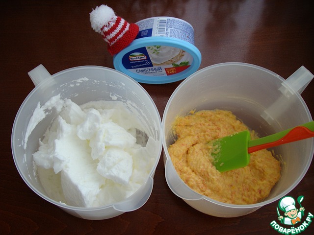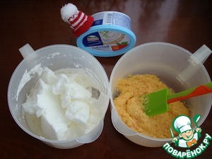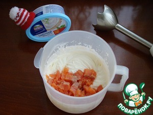В миске взбить сливки и сливочно-творожный сыр ТМ Hochland до однородной массы.