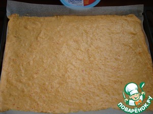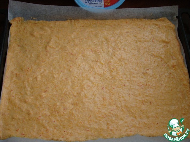 • Готовое тесто равномерным слоем распределить на противне, выстланным пекарской бумагой. Выпекать в разогретой до 170-180* духовке минут 15. (ориентируйтесь на свою духовку).