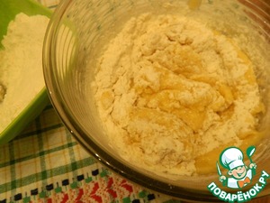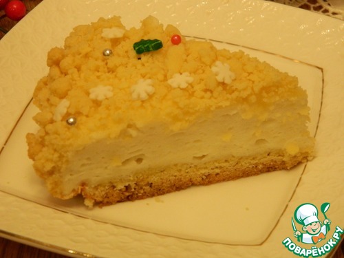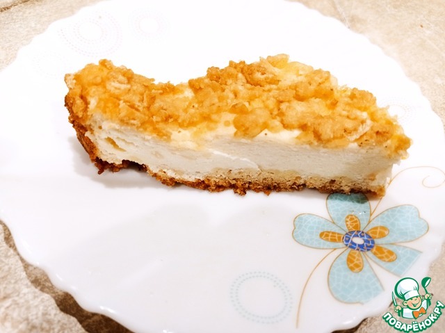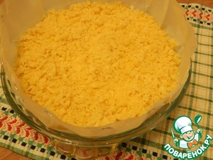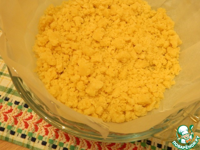 Форму размером 19 см выложим пергаментом. На дно формы высыпем часть песочной крошки, распределим ее по всему объему, придавливая хорошенько тесто к дну формы стаканом.