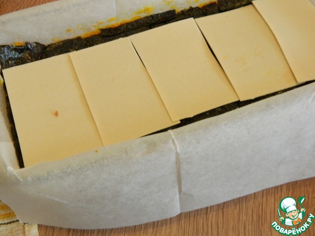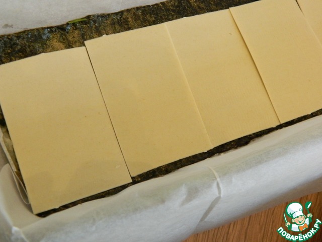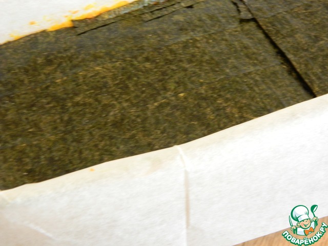 Прикрываем листом нори. Закрываем сверху пергментом, у меня были длинные концы бумаги, свисали по бокам или фольгой и ставим в духовку. Запекаем при температуре 180 градусов 30 минут.