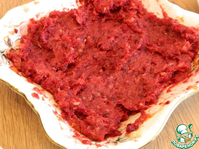 Перемешиваем, цвет не очень впечатлил, поэтому добавила измельченную погружным блендером вареную свеклу.