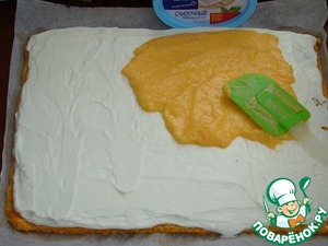 На остывший бисквит равномерным слоем нанести крем- чиз. Сверху, на крем-чиз нанести апельсиновый курд.
