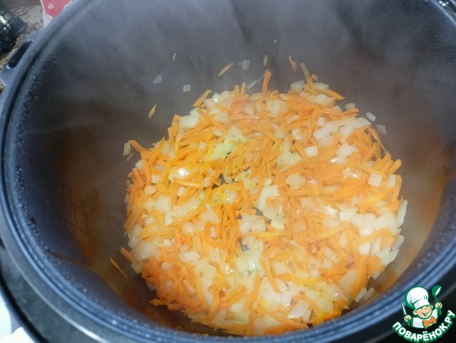 Отправляем в чашу масло, лук и морковь — Режим «Жарка» 12 минут (Не забываем перемешивать каждые 3-4 минуты)