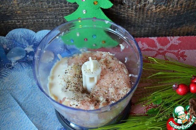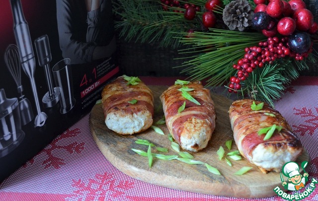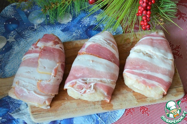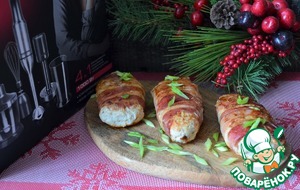 Обернуть в бекон, придав форму ёлочки. Кстати, на этом этапе заготовки можно заморозить и приготовить потом, по мере необходимости.