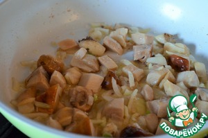 Первым делом грибы пожарить с луком (50 г.), на сливочном масле, 5-7 минут. Остудить, посолить.