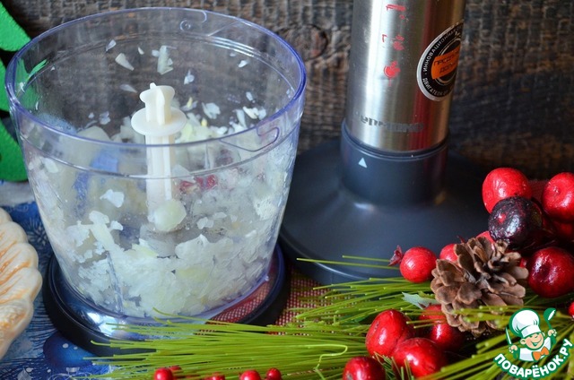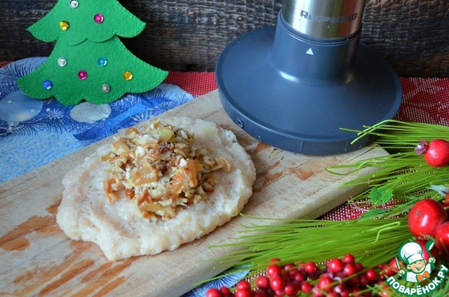 Добавить к луку, измельчить блендером. Посолить, поперчить, влить 2 ст. л. сливок и ещё раз всё пробить. Именно из небольшого количества продуктов, на пару/тройку порций очень удобно делать это блендером.