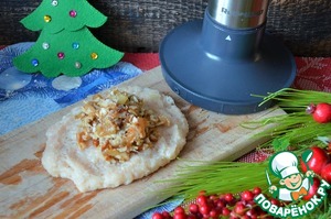Заготовки расплющить в лепёшки. На середину каждой положить 1/3 грибной начинки.