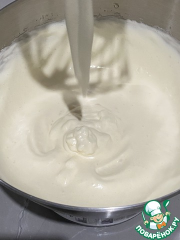 Приготовить бисквит: взбить яйца в пену, добавить сахар и взбивать ещё 3-4 минуты до получения пышной светлой массы.