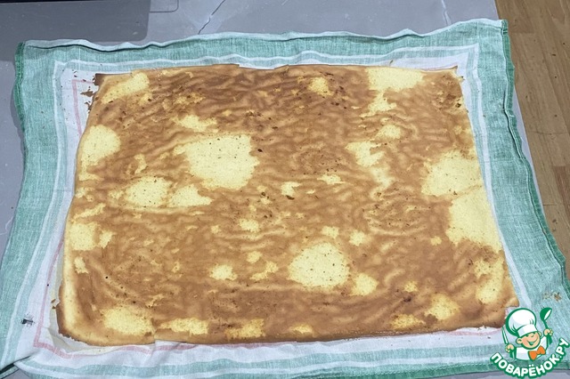 Свернуть бисквит в рулет с помощью полотенца и завернуть в пищевую пленку. Дать остыть.